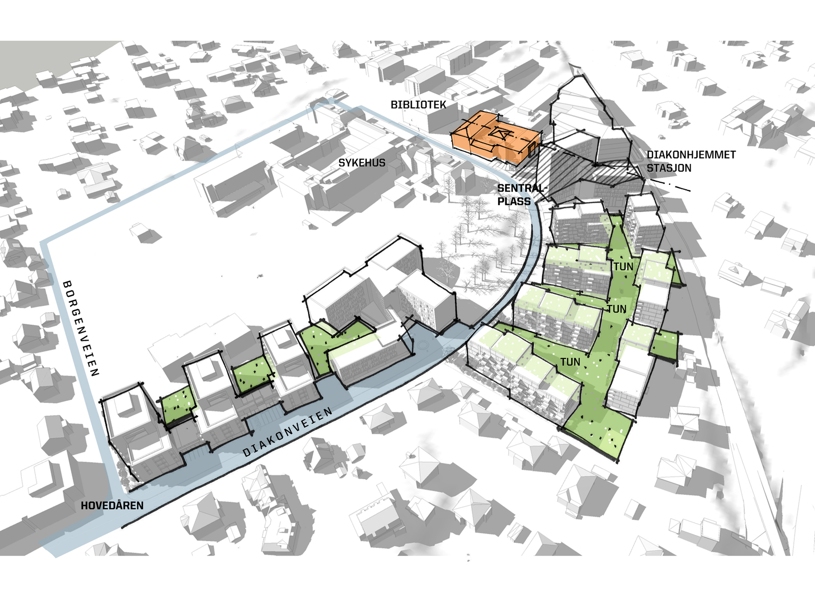 – I selve diagramtegningene vil kombinasjonen av presis håndstrek og digitalt genererte fargeflater gi en enkel og klar innfallsvinkel til å forklare konseptet og ulike delaspekter ved løsningen vi foreslår. Disse kan da formidle et slags mellomsteg fra den løse «uforpliktende» skissen til en ferdig «perfekt» digital rendering, forklarer Fiske.