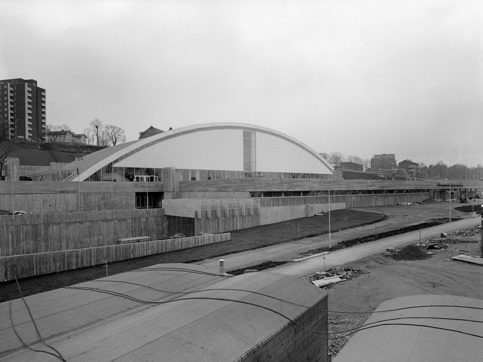 Det gamle Tøyenbadet, tegnet av Gert Walter Thuesen, med sitt karakteristiske hvelvede tak. Det opprinnelige badet stod ferdig i 1976 og ble vedtatt revet i 2019.