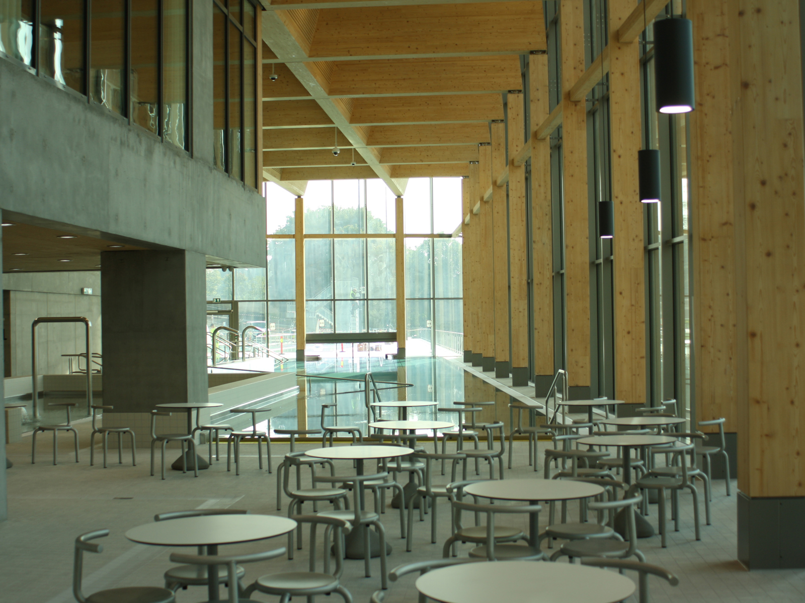 Fra kaféen i nye Tøyenbadet. I bakgrunnen ser man familiebassenget og helårs utebasseng.