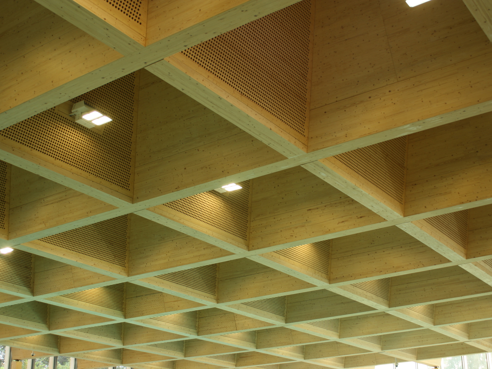 Taket løser mange behov i ett: All bæring går i én retning, mens den motsatte retningen stiver av og har en oppbygging for akustisk absorbsjon. Bunnen av hovedkonstruksjonen er som kjølen på en båt, en kompakt 70 cm høy limtrebjelke, som bærer vinger i 100 millimeter tykke massivtreplater og over et massivtredekke på 160 millimeter.