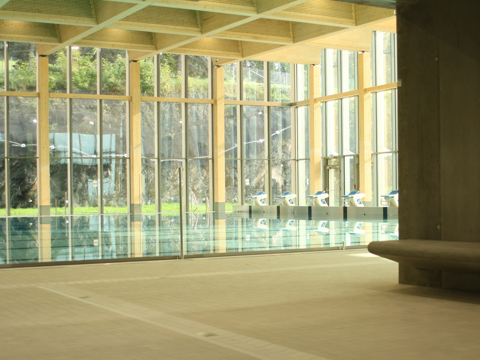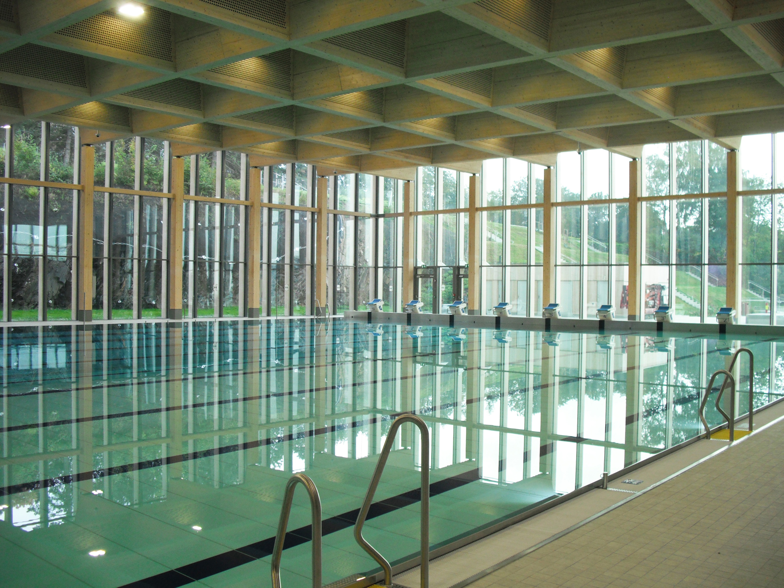 Spennet på 42 meter gjør det 50 meter lange hovedbassenget til et stort og luftig rom. I et så stort rom føles taket som en vev, en flettet kurv, der blikket ledes horisontalt bortover.