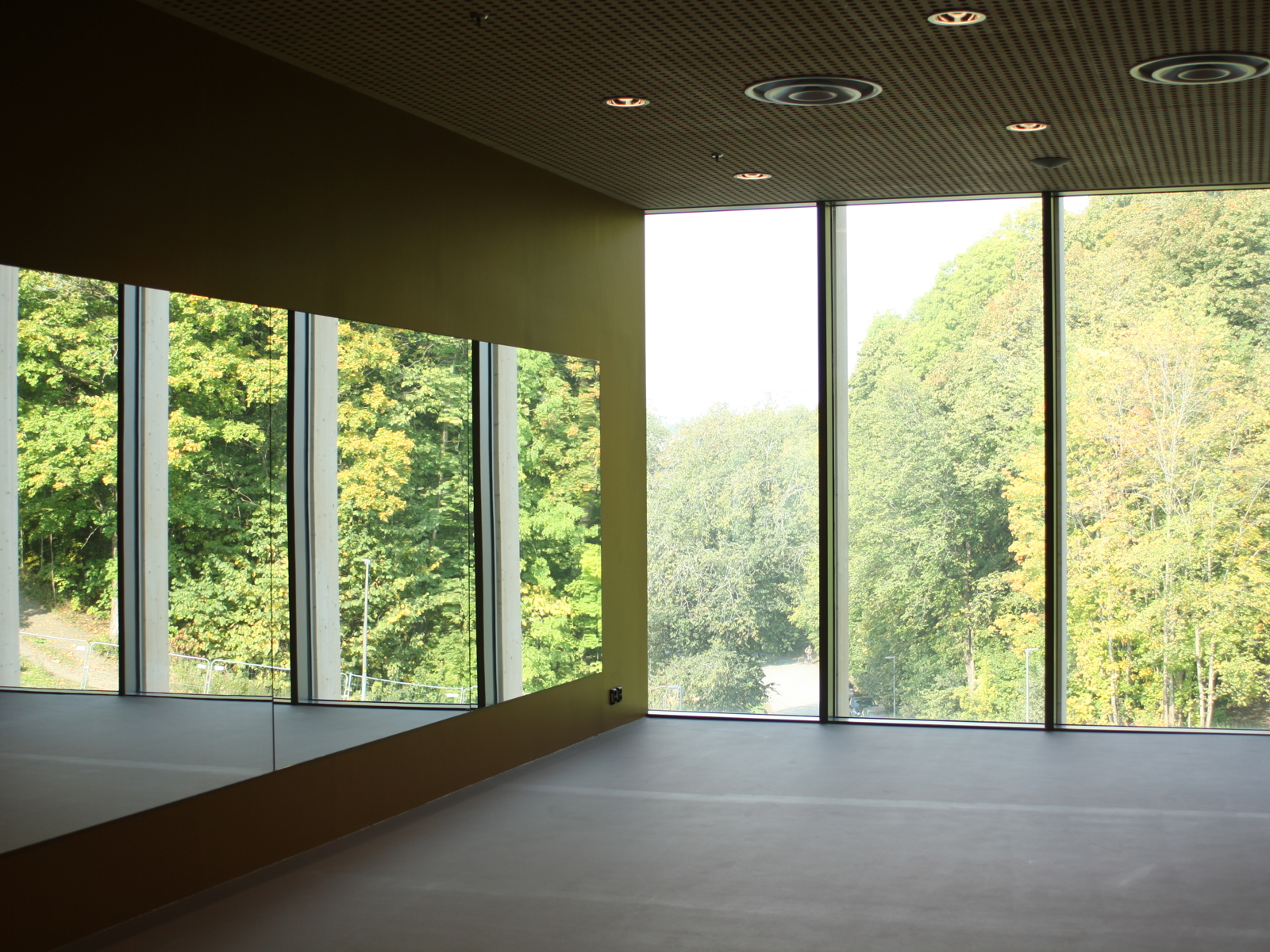 Betongen markerer klimaskillet inn til svømmehalldelen av bygget.