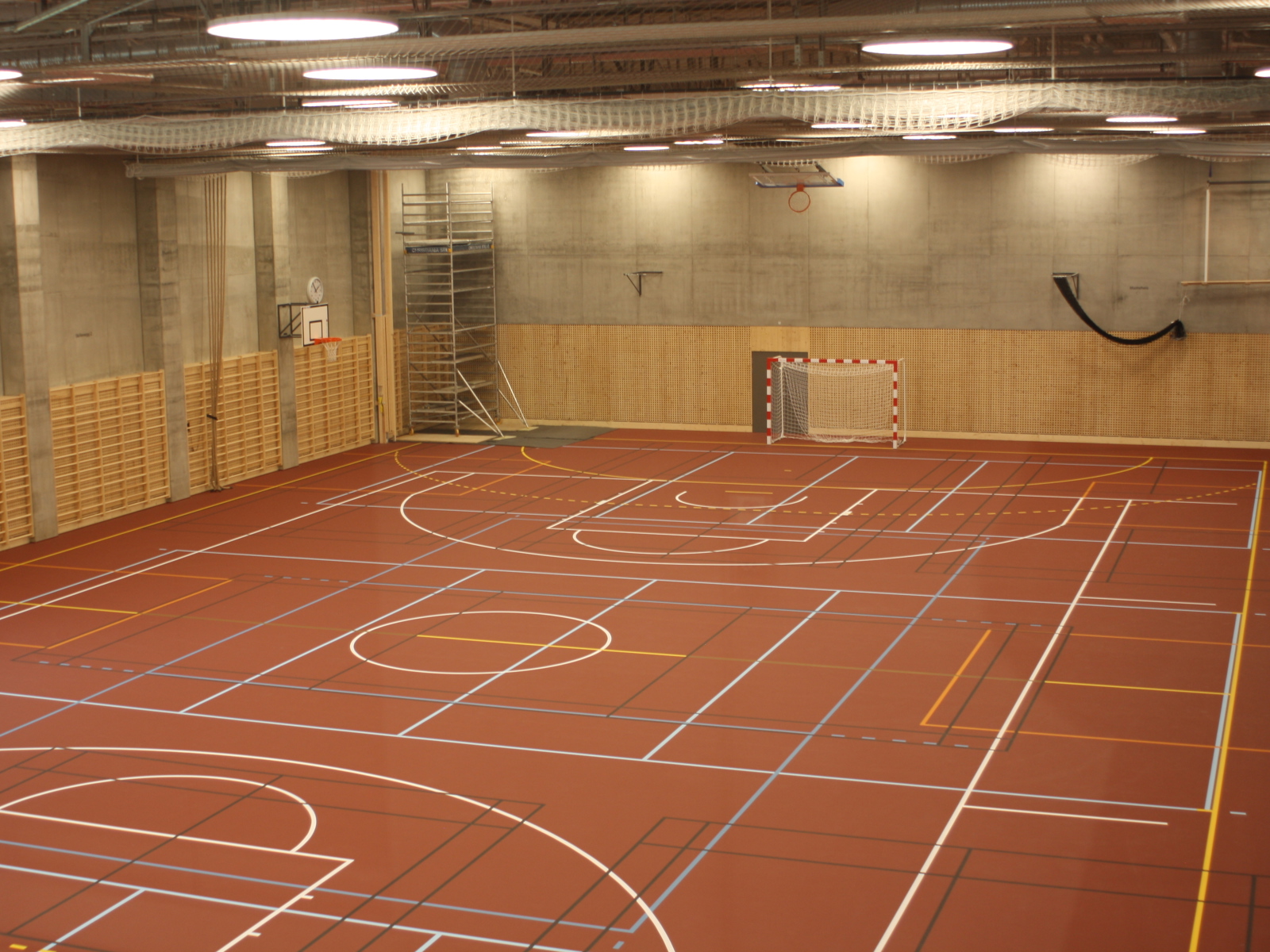 Der man har tilsatt farger, utover ren betong, tre og stål, har man vært konsekvent og brukt det Waage kaller «Tøyenpaletten»: rødtoner, oransje og terrakotta. Den går igjen på gulvet i flerbrukshallen, skapene og flisene i dusjen.