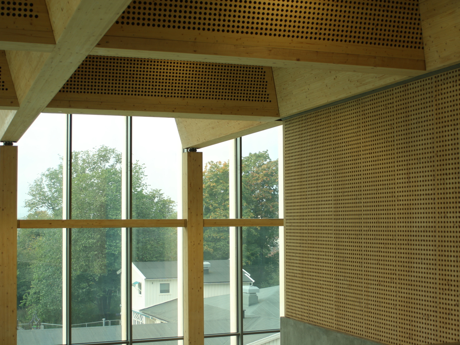 All bæring går i én retning, mens den motsatte retningen stiver av og har en oppbygging for akustisk absorbsjon. Bunnen av hovedkonstruksjonen er som kjølen på en båt, en kompakt 70 cm høy limtrebjelke, som bærer vinger i 100 millimeter tykke massivtreplater og over et massivtredekke på 160 millimeter.