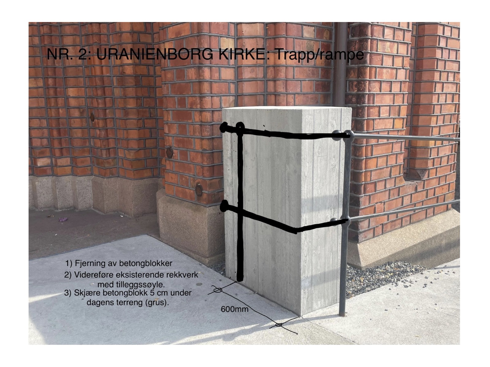 I forslaget fra fellesrådet, som både Riksantikvaren og biskopen har godtatt, fjernes betongmeglerne foran inngangen, og erstattes av rekkverk med tilleggssøyle som føres helt fram til kirkeveggen.