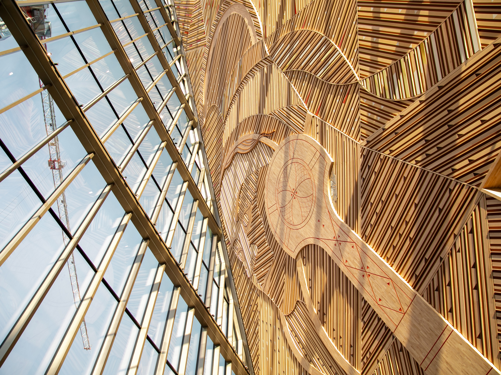 Det enorme kunstverket som pryder inngangspartiet i det nye regjeringskvartalet, ble avduket tirsdag. Når kunst og rom går opp i en høyere enhet, tillater det et høyere budsjett, sier arkitektene.
