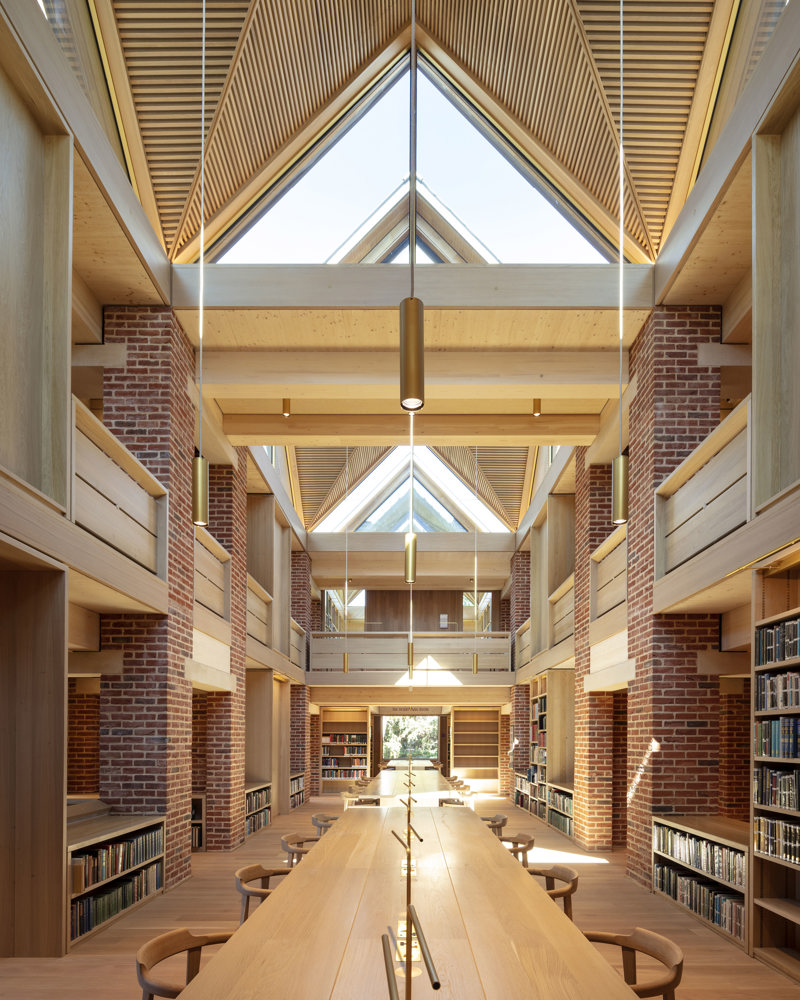 Interiøret fra Niall McLaughlins nye bibliotek ved Magdalene College ved Cambridge-universitetet. Ifølge arkitekten er det nye prosjektet i massivtre og tegl et ekko av den eksisterende bebyggelsens arkitektur.