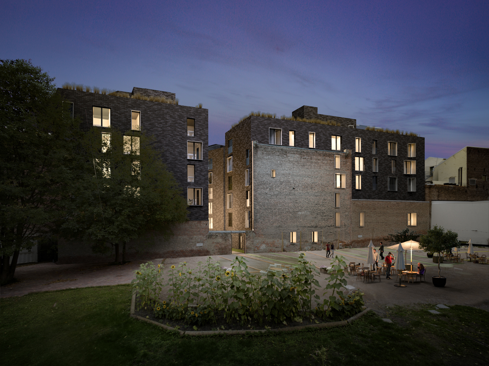 En original mur i bakkant av bygningen danner inspirasjon og utgangspunkt for valget av tegl i fasaden.