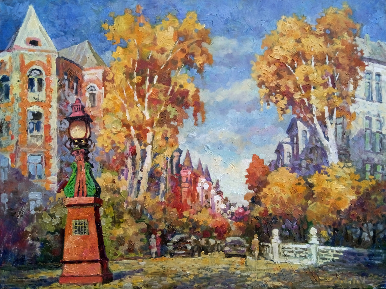 Maleriet «Kharkiv februarmelodi» fra hjembyen Kharkiv ble tegnet på en frost- og solrik dag i 2012. Bildet viser det gamle sentrum i byen og er i dag i en privat samling i et europeisk land.
