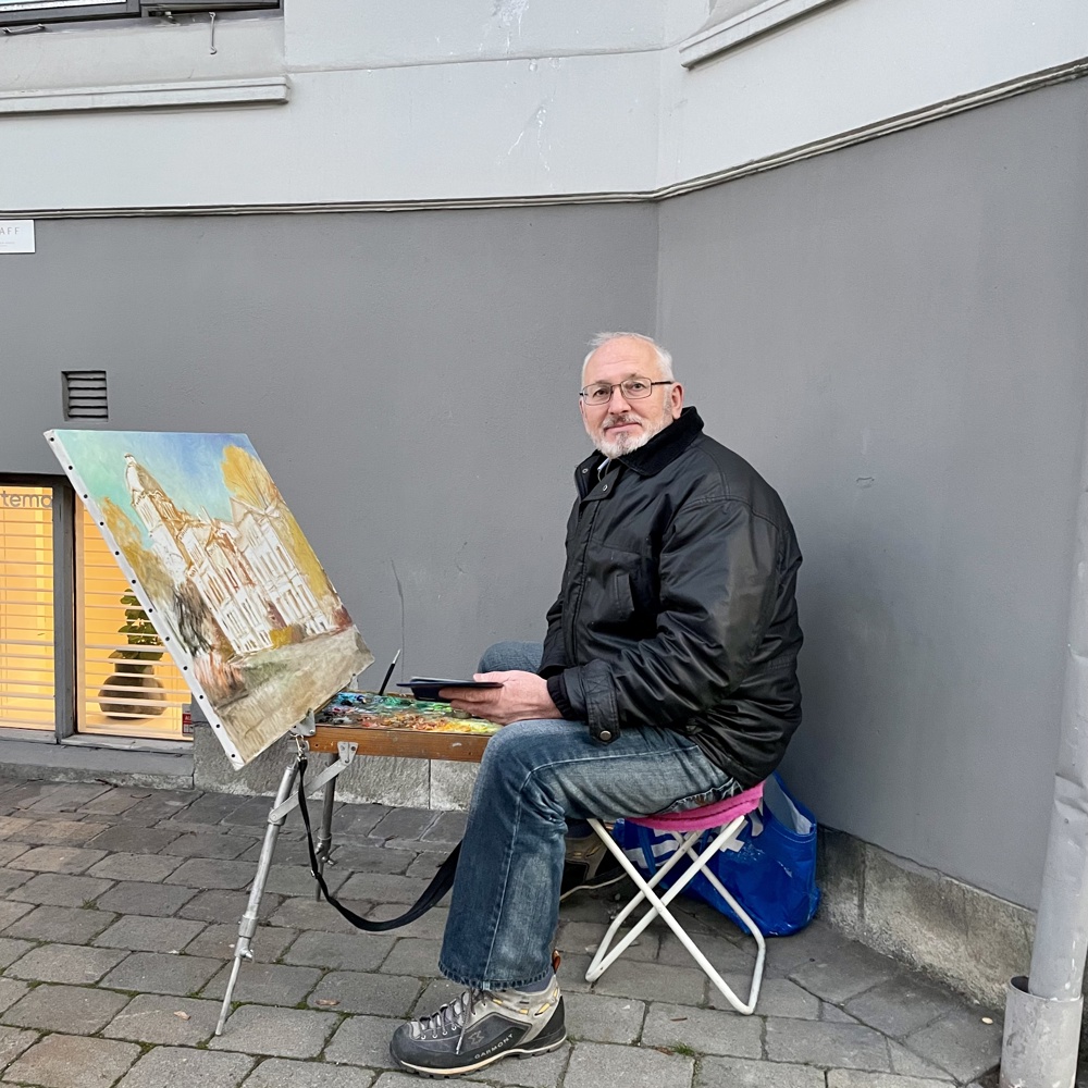 Leonid Zolotarev fra gatemalerens eget perspektiv en oktoberdag i Gustavs gate, Homansbyen i Oslo.