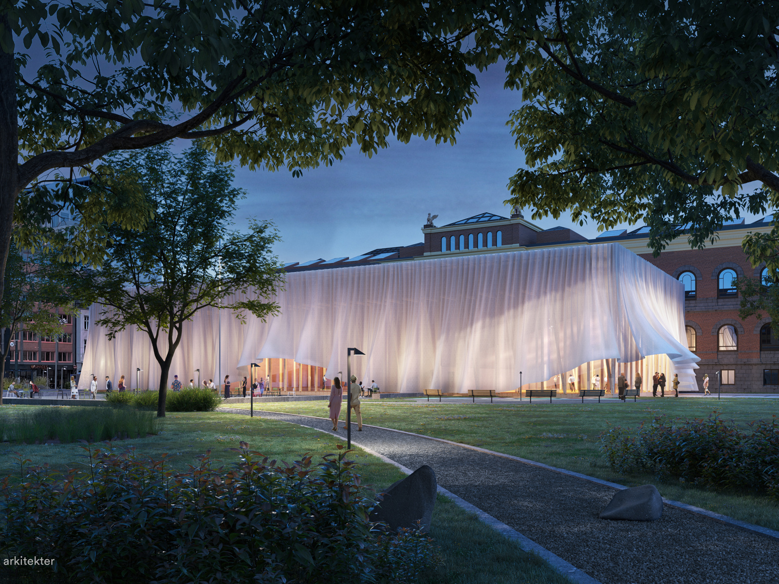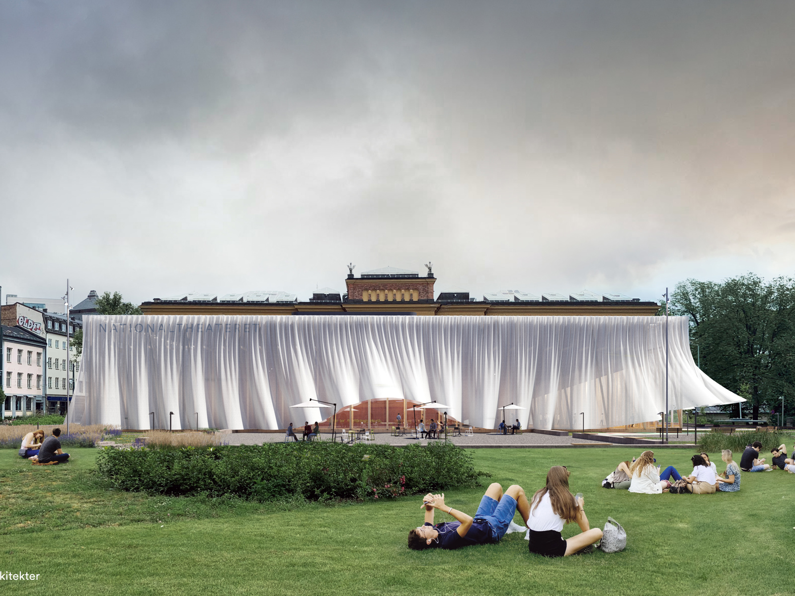 Slik så Mad arkitekter i 2021 for seg et midlertidig teaterbygg på Tullinløkka. Bak skimtes toppen av det tomme, fredede Nasjonalgalleriet.