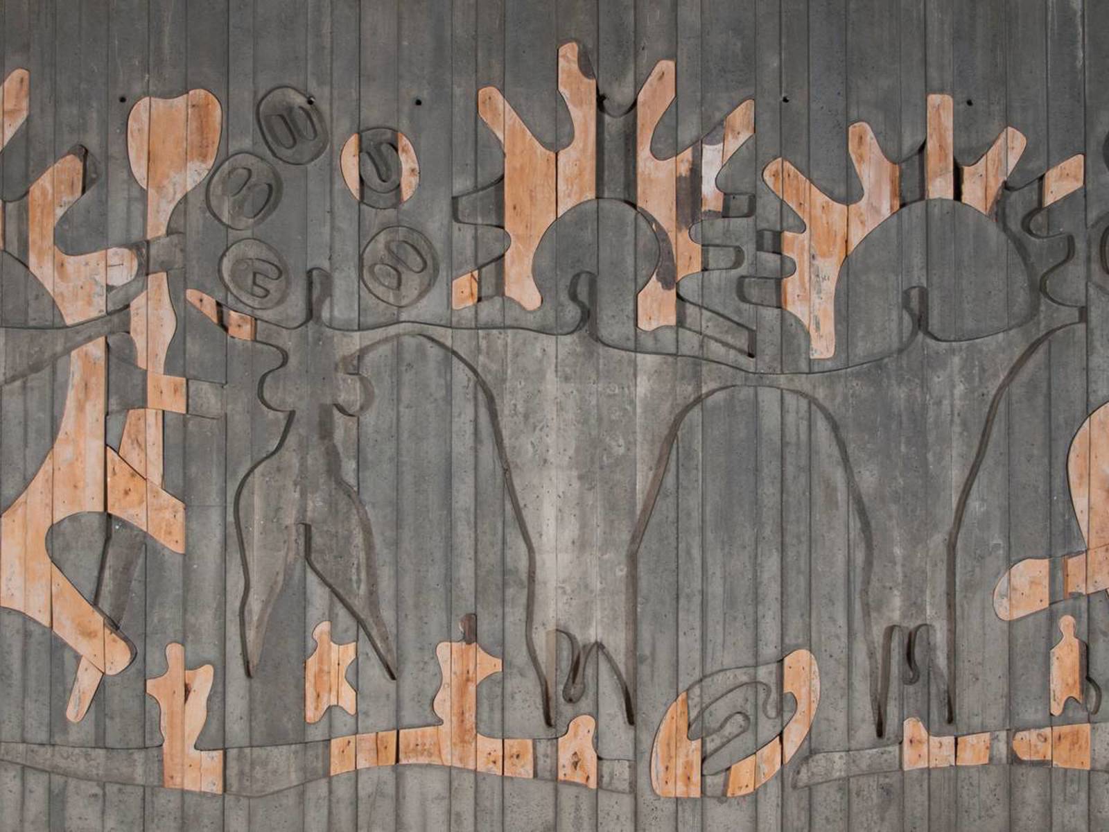 Museumsbygget ble utsmykket av den samiske kunstneren Iver Jåks (1932-2007), med det omfattende betongrelieffet Gudenes dans (1972), som Østby forteller om.