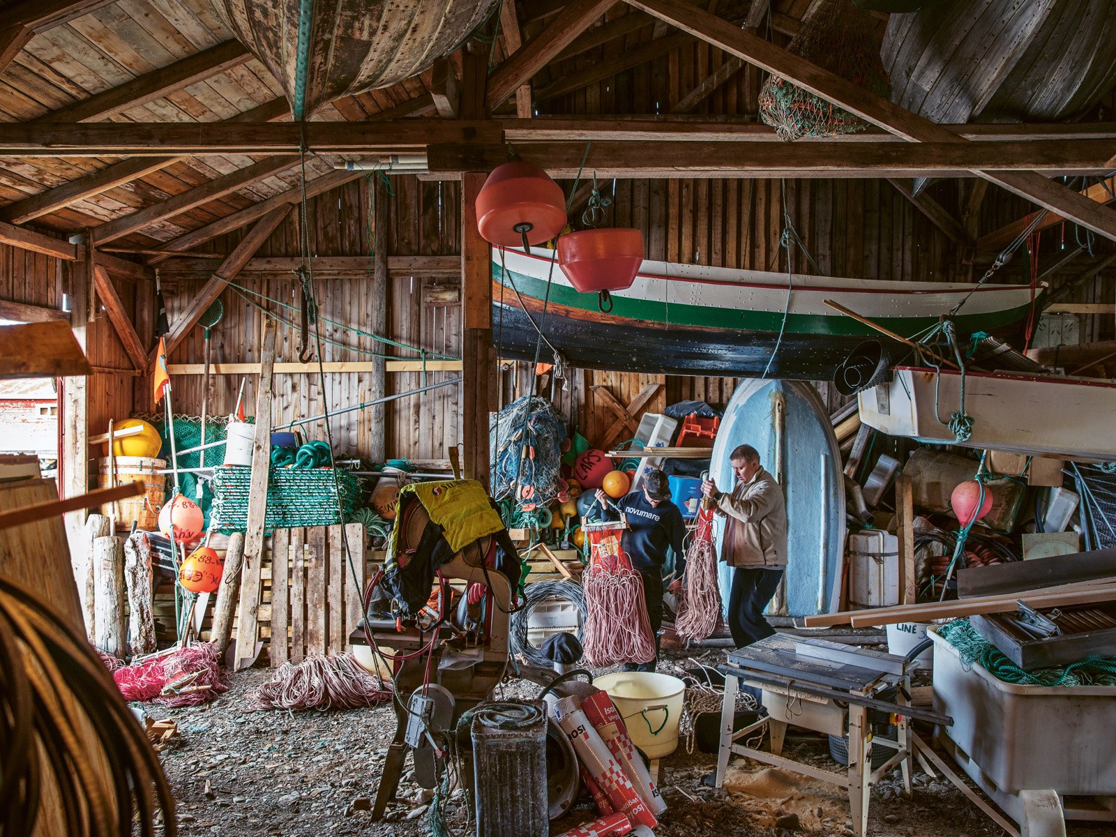 Mange naust er heldigvis i full bruk fremdeles. Her to unge fiskere, Kenneth Lauritsen og Paulius Budrevicius, i Lebesby, Finnmark som gjør klar line til hysefiske.