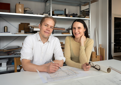 Innvendig er det benyttet en begrenset materialpalett i eik, stål og betong.