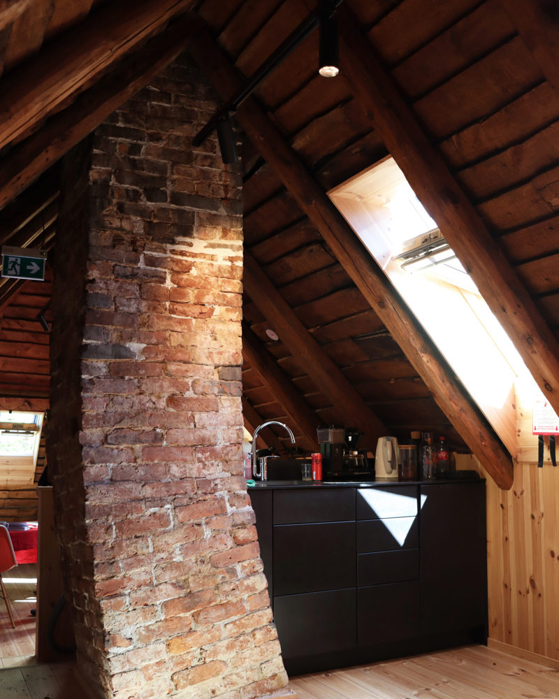 Råloft i Stavanger etter istandsettelse hvor historiske elementer som den originale teglsteinspipen er bevart, samtidig som moderne fasiliteter som kjøkken og kontorplass er integrert.