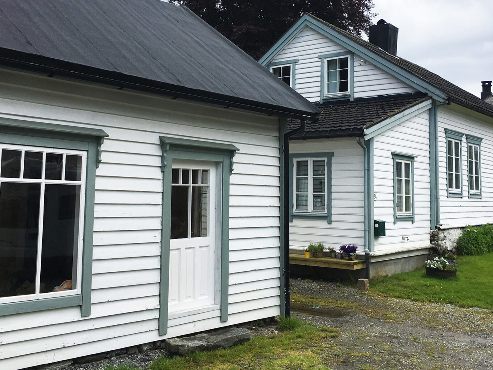 Bygningene etter rehabilitering. Stuehuset og sidebygningen står bare fire meter fra hverandre, noe som kompliserte brannkravene. Sidebygningen har muligheter for rømming fra vindu i andre etasje, og to dører i første etasje.