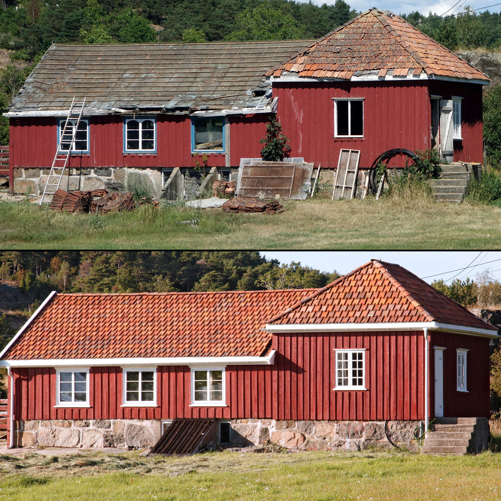 Det gamle hønsehuset på Søndre Årøy gård, som ble satt opp på murene til det gamle bolighuset. Foto fra før og etter istandsetting. Bygget er nå i bruk som sauefjøs.