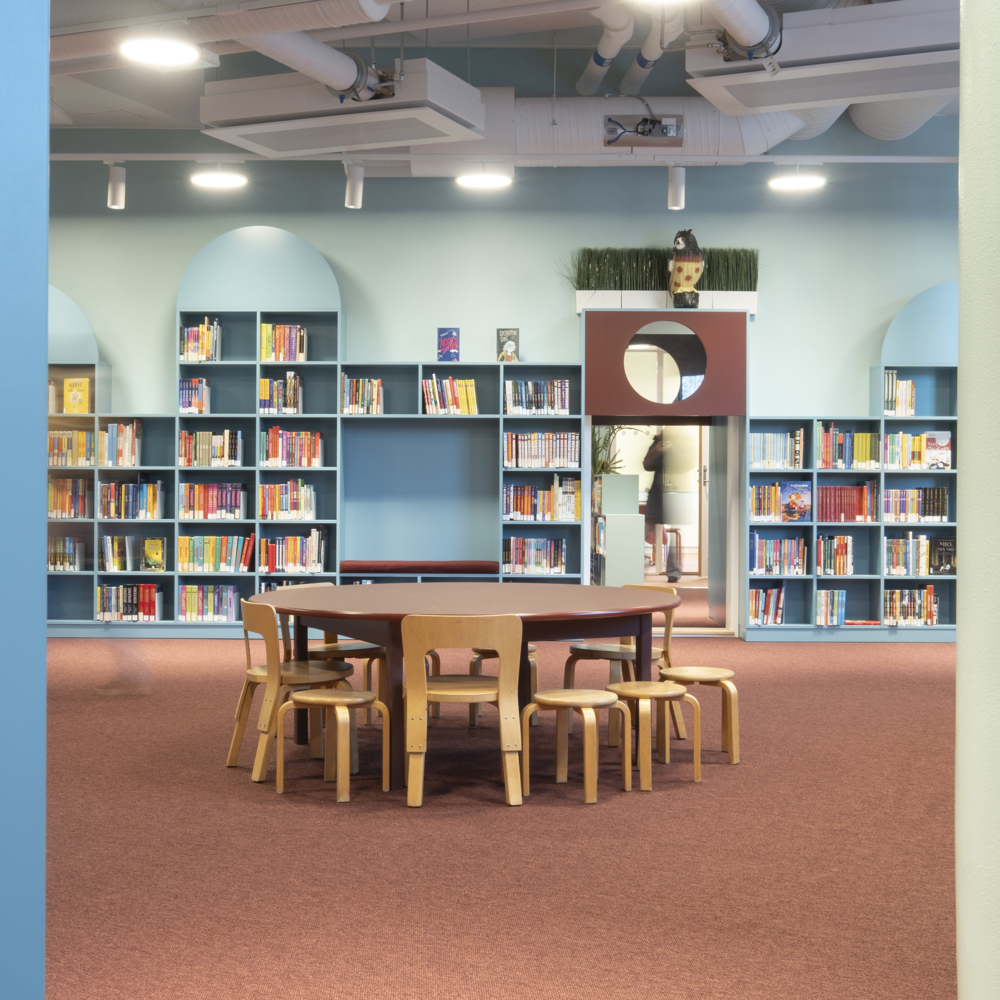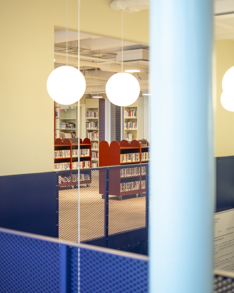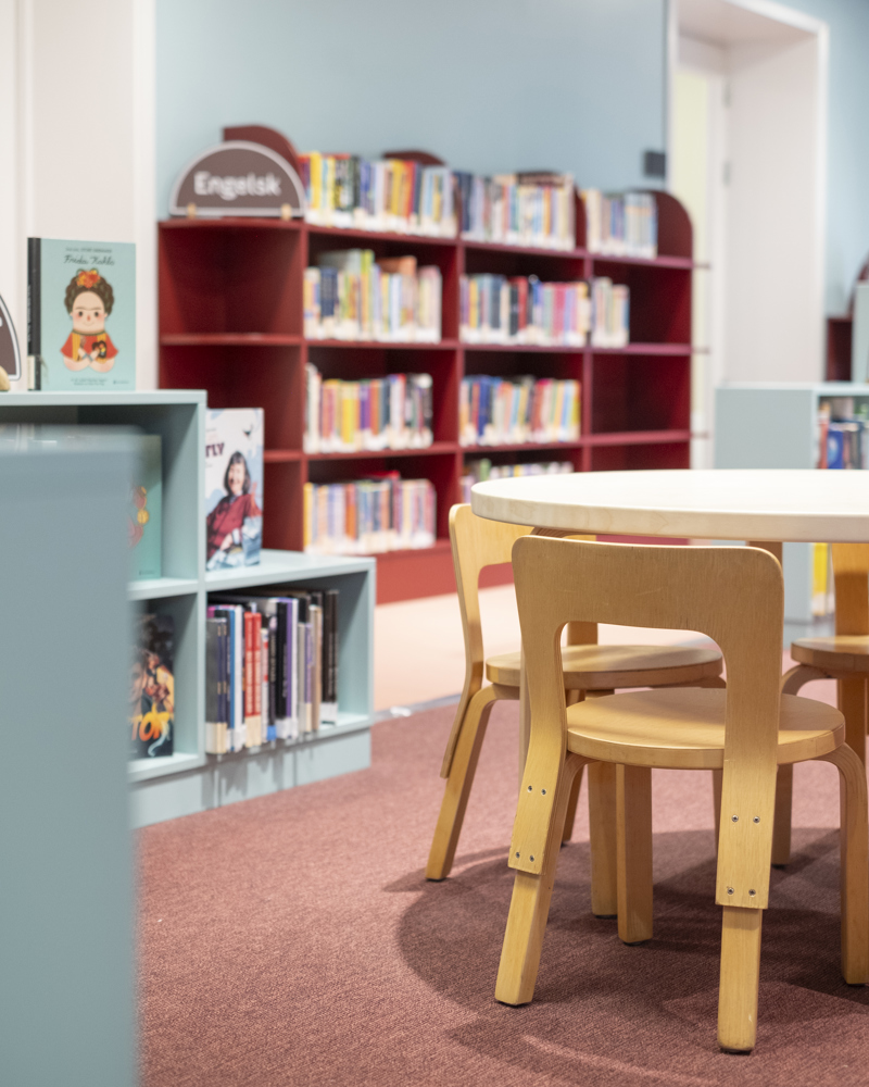 Holmliahylla i bakgrunnen, med sine karakteristiske runde former, er tegnet spesielt til biblioteket.