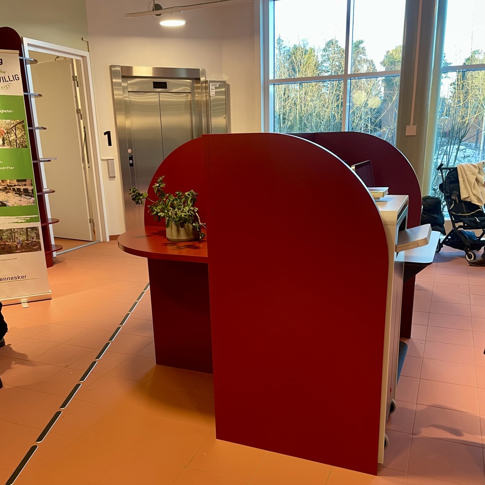 Etter en runde rundt i lokalene, er vi tilbake ved inngangen. Det har vært viktig at man blir møtt av mennesker, ikke maskiner, forteller Grytten, som har fått hjelp av arkitektene til å pakke inn og gjemme bort utlånsmaskinene.