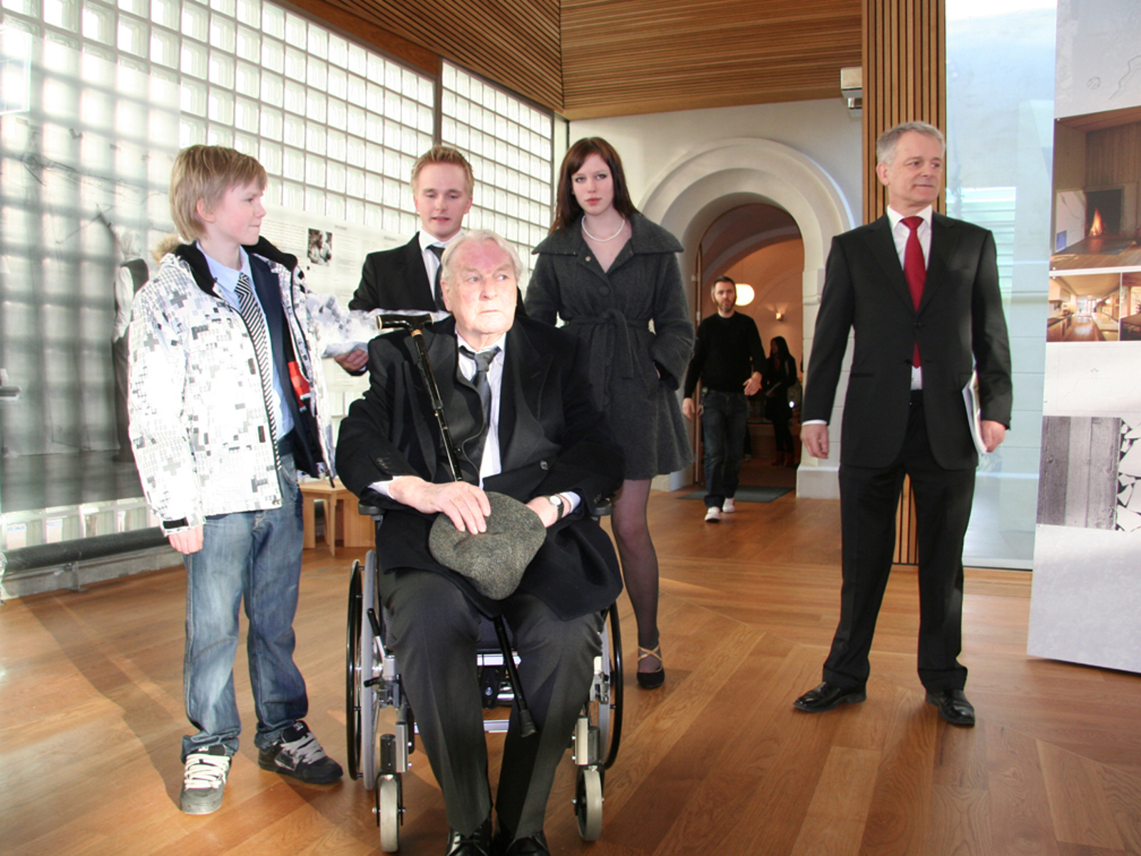 Sverre Fehn sammen med sine barnebarn og den gang seniorkurator Ulf Grønvold i paviljongen han selv tegnet, under åpningen av Nasjonalmuseet Arkitektur på Bankplassen i 2008. I disse dager er museumsbygningen stengt grunnet oppussing.