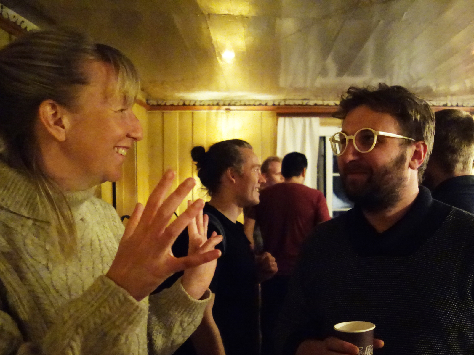 Ingrid Grændsen i engasjert passiar med Maarten Gielen (Rotor) under Rørosseminaret 2022. I bakgrunnen Alexander Furunes.