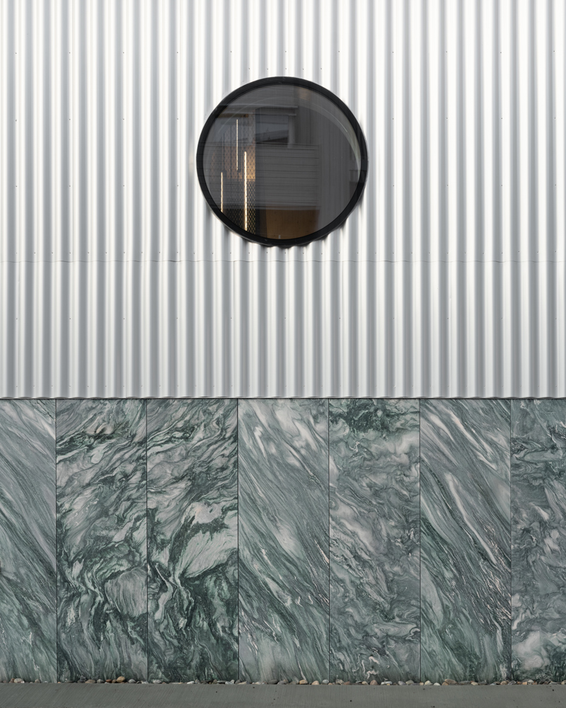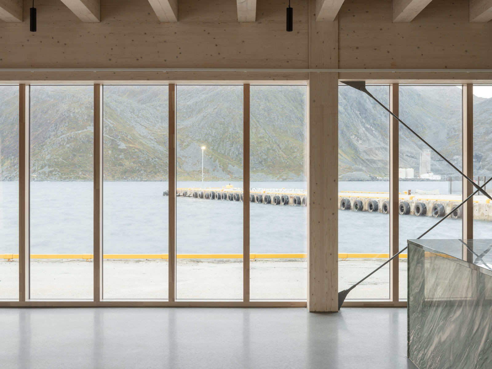 Resten av bygget er sinusplater i resirkulert aluminium (75 prosent resirkuleringsgrad), mens konstruksjonen er i CLT, montert på kaia i tidvis ekstremvær. De runde koøyevinduene er et vink til den marine konteksten. I interiøret er CLT-veggene eksponert.