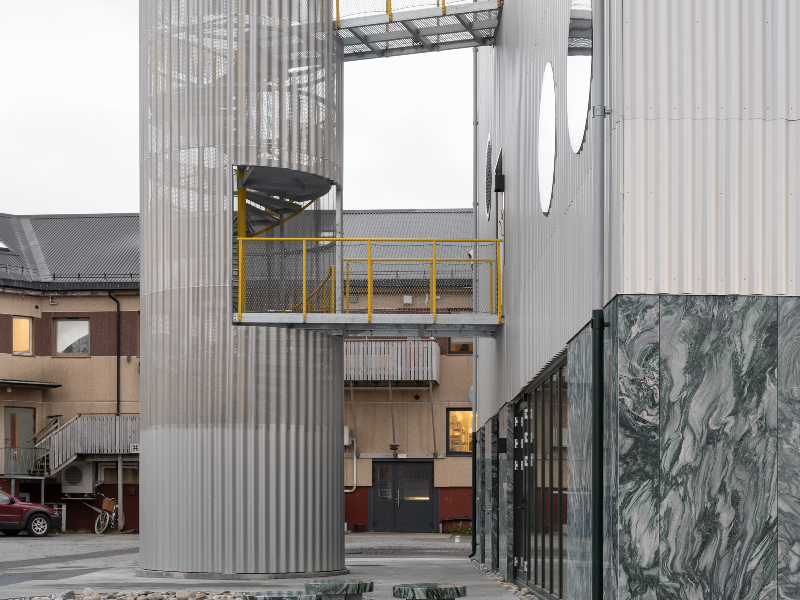Masikvartsitt fra Kautokeino er benyttet i første etasje. De runde koøyevinduene er et vink til den marine konteksten.