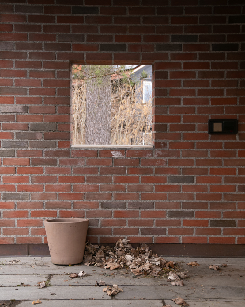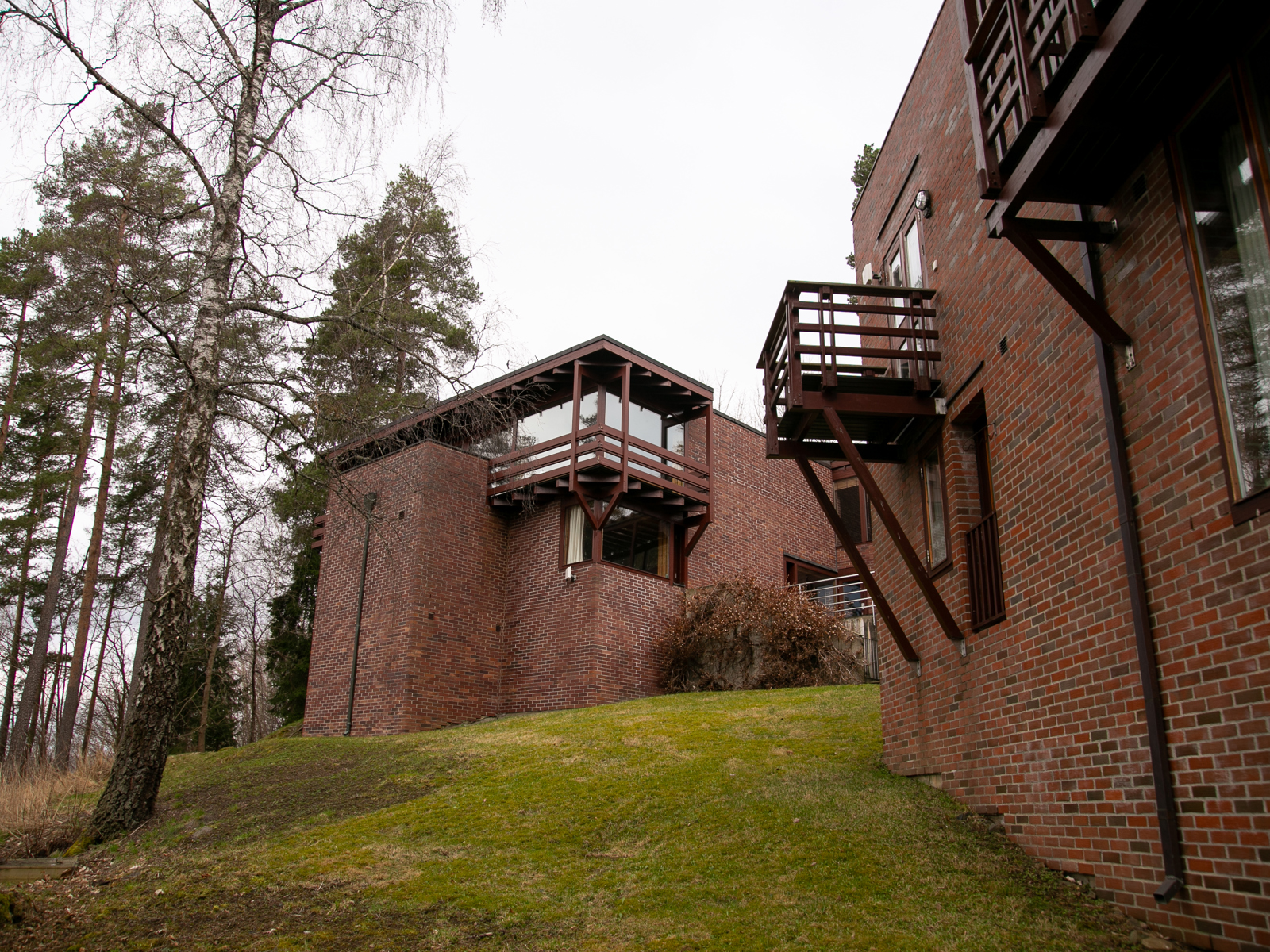 Løsningen ble to kubiske former i tegl hvor terrassen tar imot deg fra ankomstveien, som ligger høyere enn tomten. Takterrassen og inngangspartiene gir deg horisonten og den ro du trenger før du åpner døren til de to husenes labyrintiske romløsninger. Leken med de kvadratiske planers vridninger 45 grader gjør at bygningenes hjørner blir vesentlige. På disse punkter utfolder arkitekturen sin konstruktive akrobatikk.
