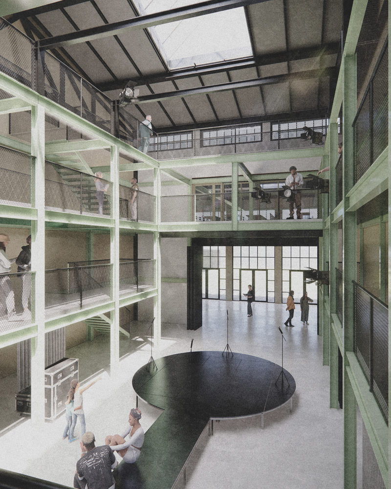 – Bygningen er et tidligere lager for kabler, konstruert som en stor hall med kraftige, etasjehøye stålreoler og elementdekker av betong. Flere av reolene må demonteres for å gi plass til scenerom, men noen bevares i vrimlearealet, hvor de danner et vertikalt amfi for forestillinger. Dette sikrer både en historisk forbindelse til industriepoken og gjenbruk av stålet i prosjektet, forteller arkitekten.