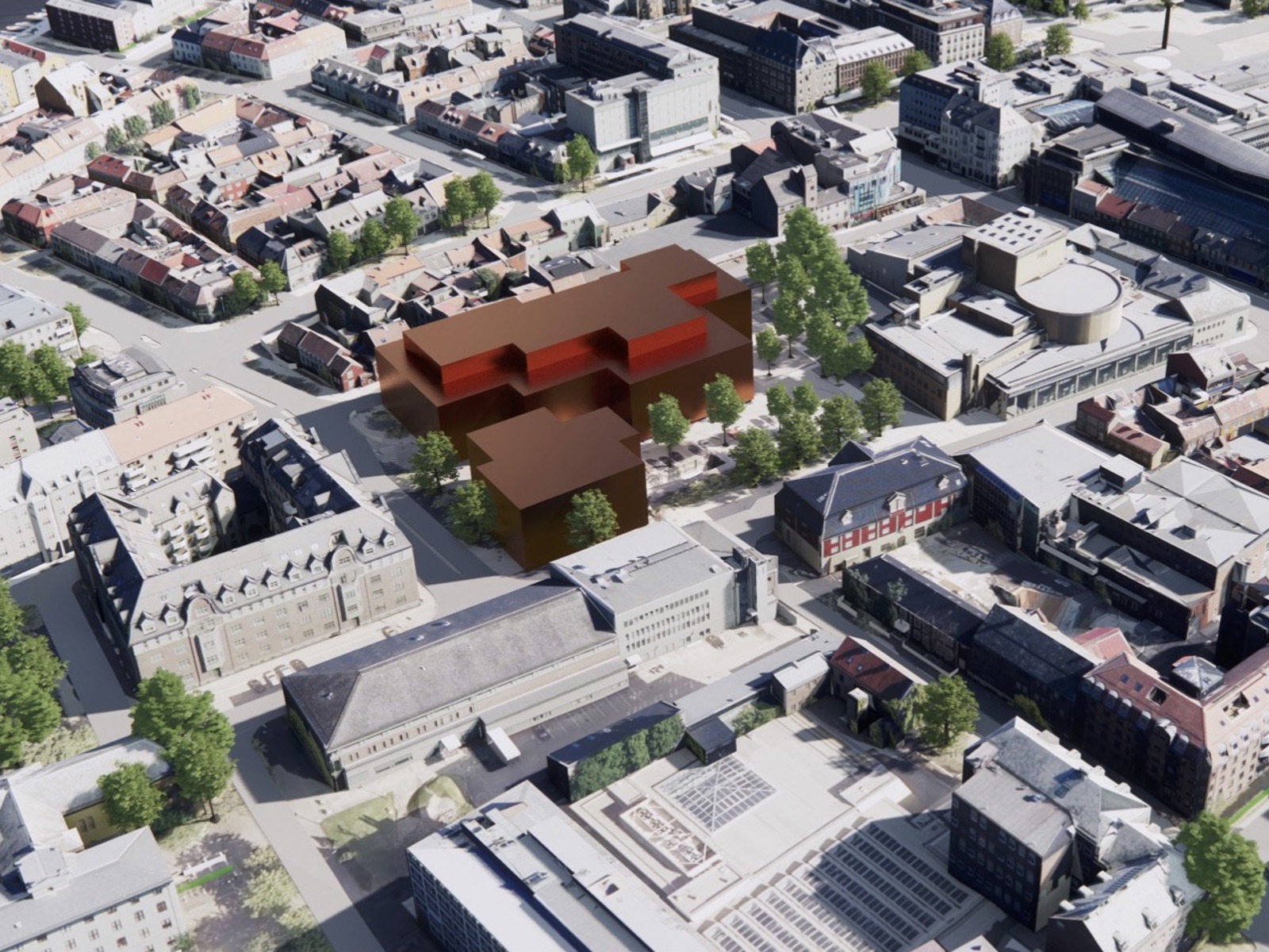 Illustrasjonen viser at det er mulig å etablere tydelige og markante bygningsvolumer og samtidig skape et flott offentlig grønt byrom mellom ny bebyggelse og Trøndelag Teater, skriver Dyrvik arkitekter og Christian Pagh i sin rapport fra 2021.