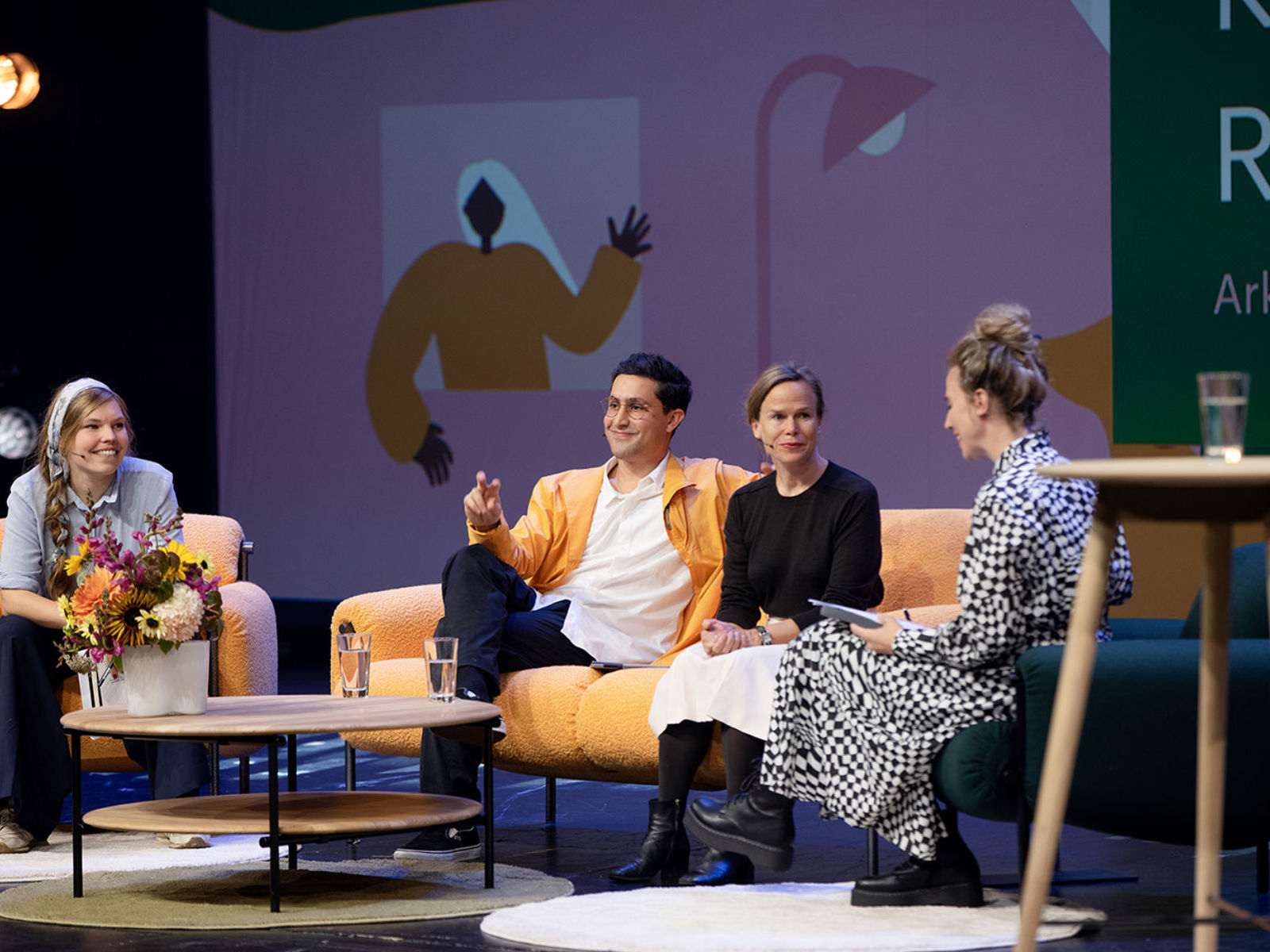 Ragnhild Augustsen (t.v) og Karoline Birkeli-Gauss fra podkasten Våre Steder. Her fra innspilling under Arkitekturdagen 2022 i samtale med arkitektene Navid Navid og Anne Chavepayre.