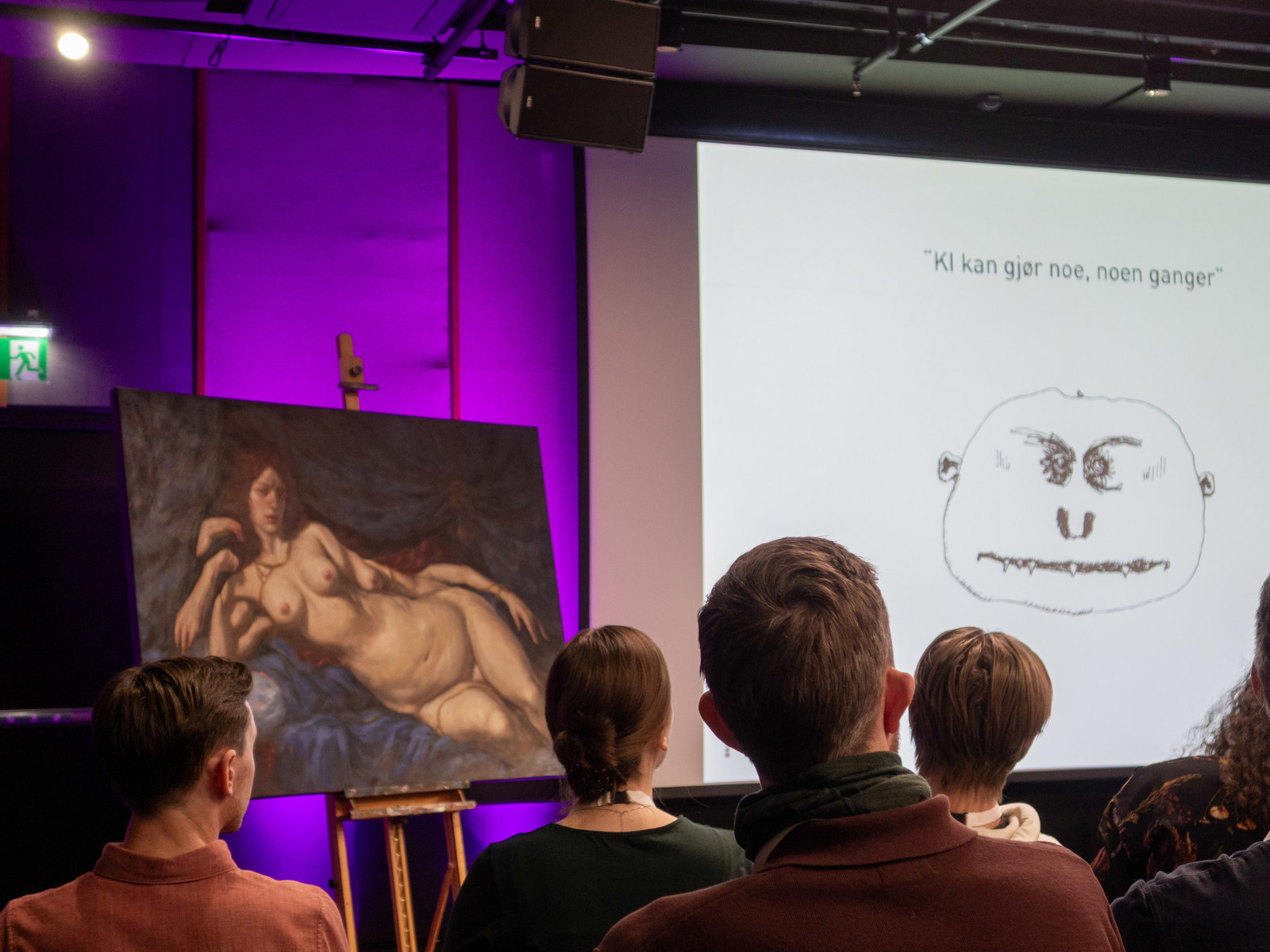 «KI kan gjøre noe, noen ganger», er ASAS arkitekturs mantra når det gjelder kunstig intelligens. Her er slagordet side om side med et oljemaleri basert på dårlig KI-genererte menneskekropper, signert designer, kunstner og kreativ teknolog Syver Lauritz.