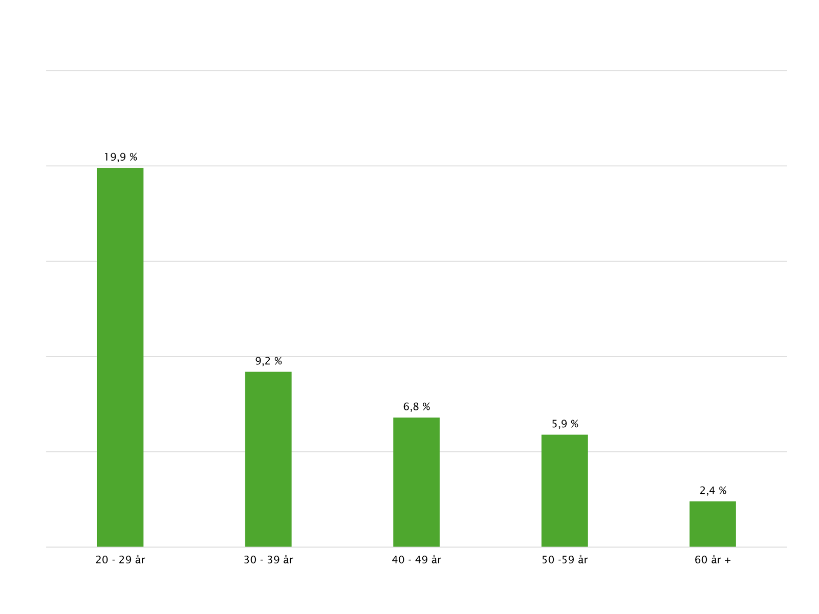 Videre viser tallene at ledigheten er klart høyest blant de yngste respondentene. I aldersgruppen 20-29 år er 19,9 prosent arbeidsledige, en betydelig høyere andel enn i eldre aldersgrupper.