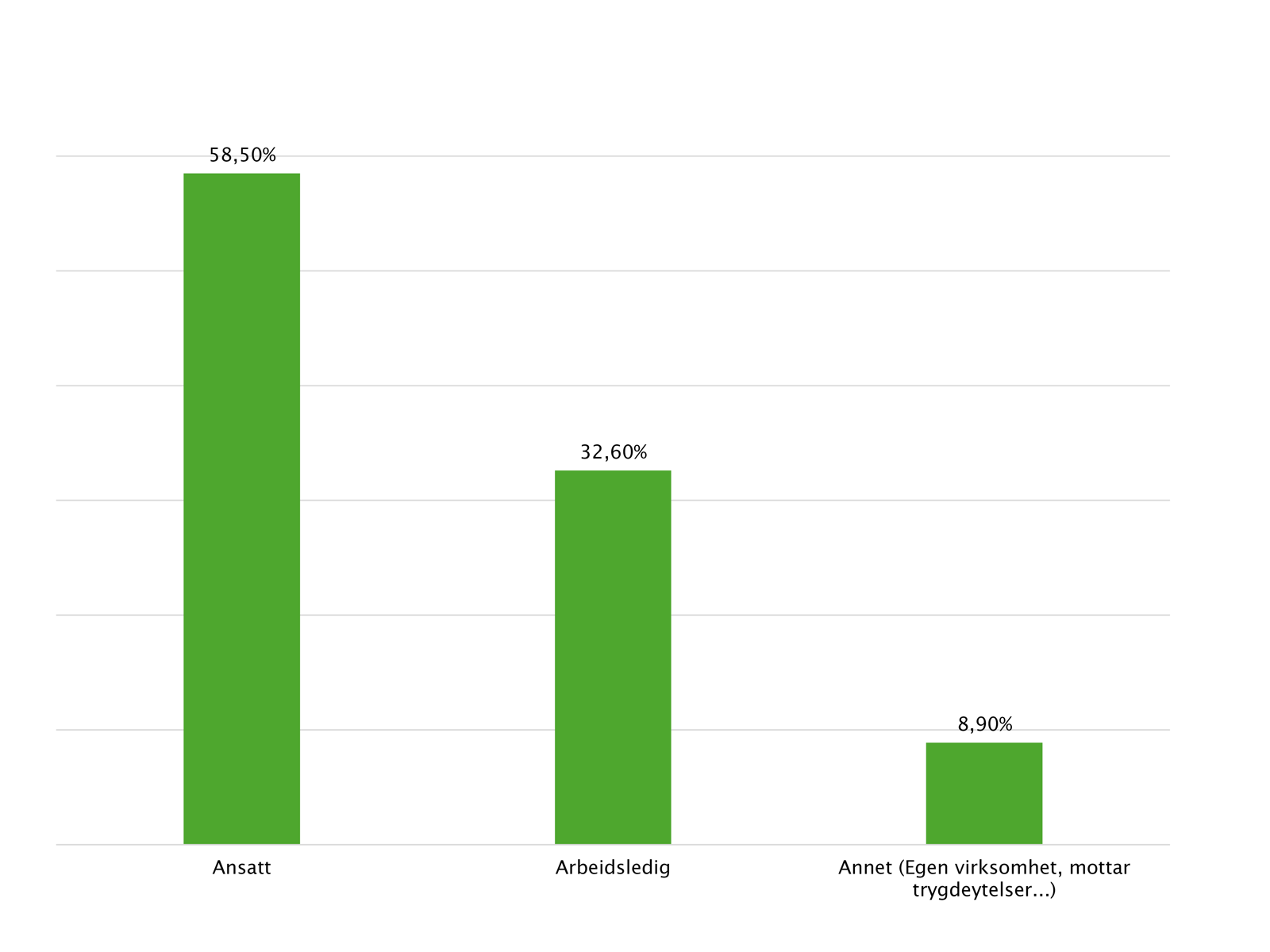 Blant respondentene oppgir 83,3 prosent at de er i arbeid høsten 2025. Samtidig er 8,7 prosent arbeidsledige, og ytterligere 1,7 prosent er i oppsigelsestid. Andelen fast- og heltidsansatte er noe lavere enn i forrige måling, men ligger fortsatt høyt blant dem som er i jobb.