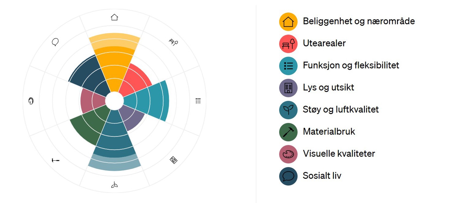 Slik ser Bokvalitetsrosen ut i bruk, med poengsummene for de ulike kvalitetene visualisert gjennom et eksempelprosjekt. Oversikten til høyre viser de ulike parameterne.