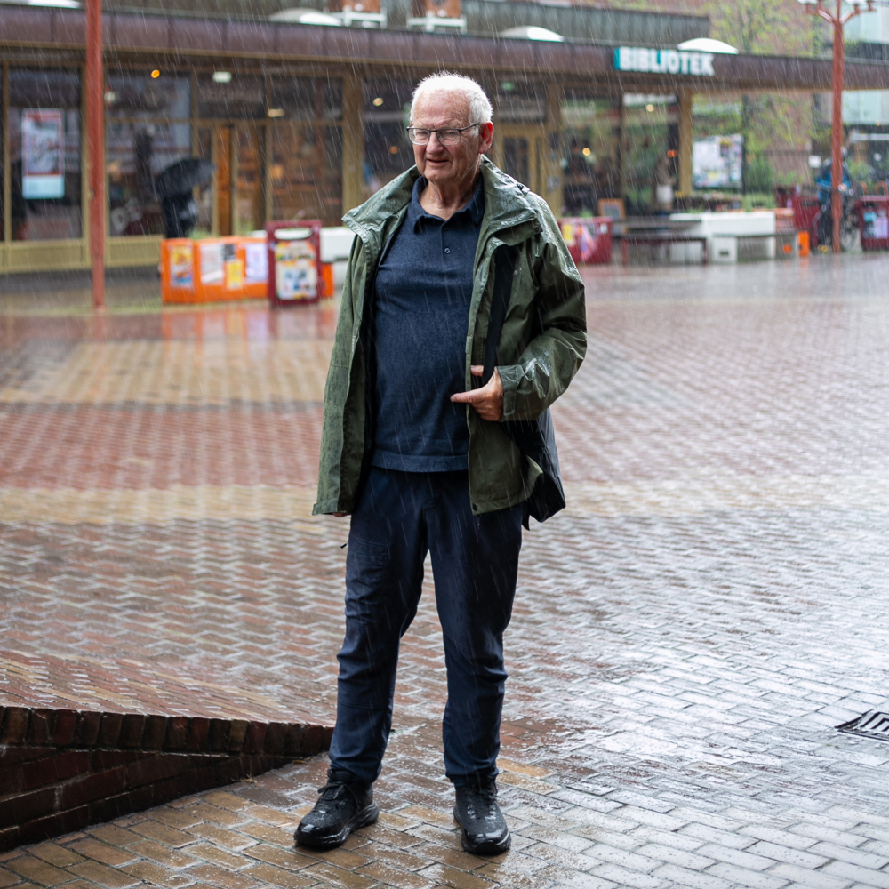 Magnus Boysen, arkitekt og styremedlem i Tøyen boligbyggelag, i regnværet på Tøyen torg. Med sin nye bok «Boligmarked – eller hjem for alle?» tar han til orde for en tredje boligsektor.
