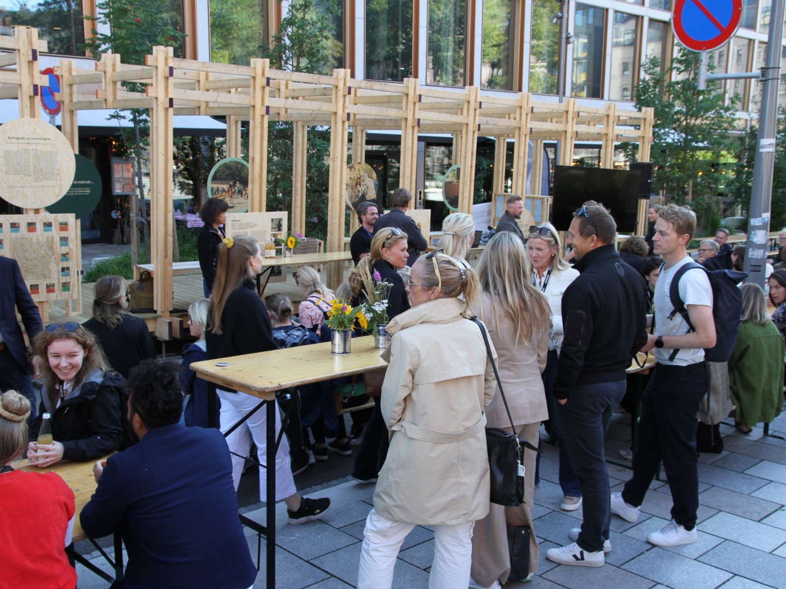 Det var godt med folk på arrangementet til Levende gater og Bykuben unde Oslo Urban Week. Trepaviljongen som er bruk er laget av studentprosjektet Trestykker2023.