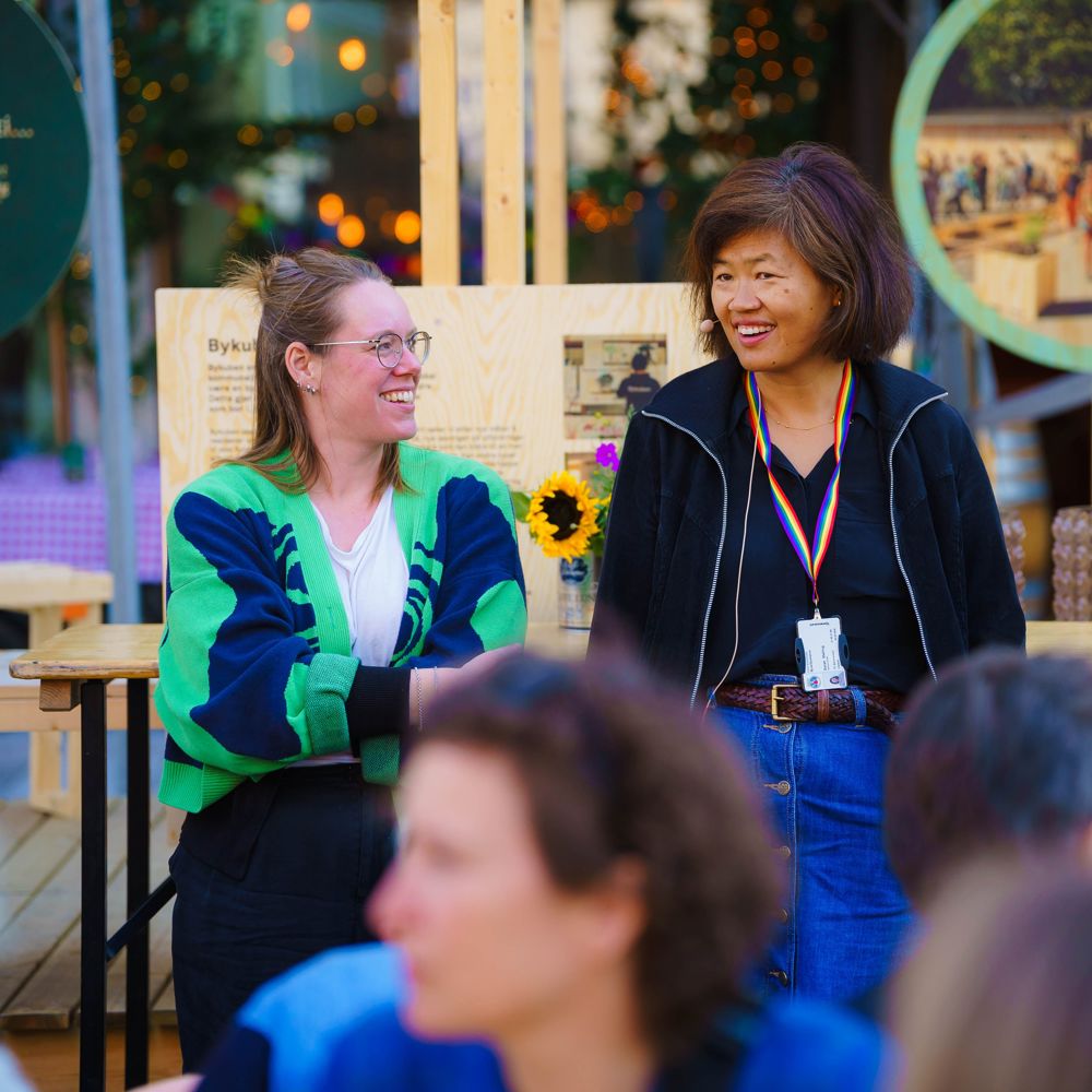 Oda Stræte fra Bykuben og Sarah Malling i Bymiljøetaten i Oslo i samtale under arrangementet «Hva skjer når det gis mer plass til mennesker og natur i byrommet?»