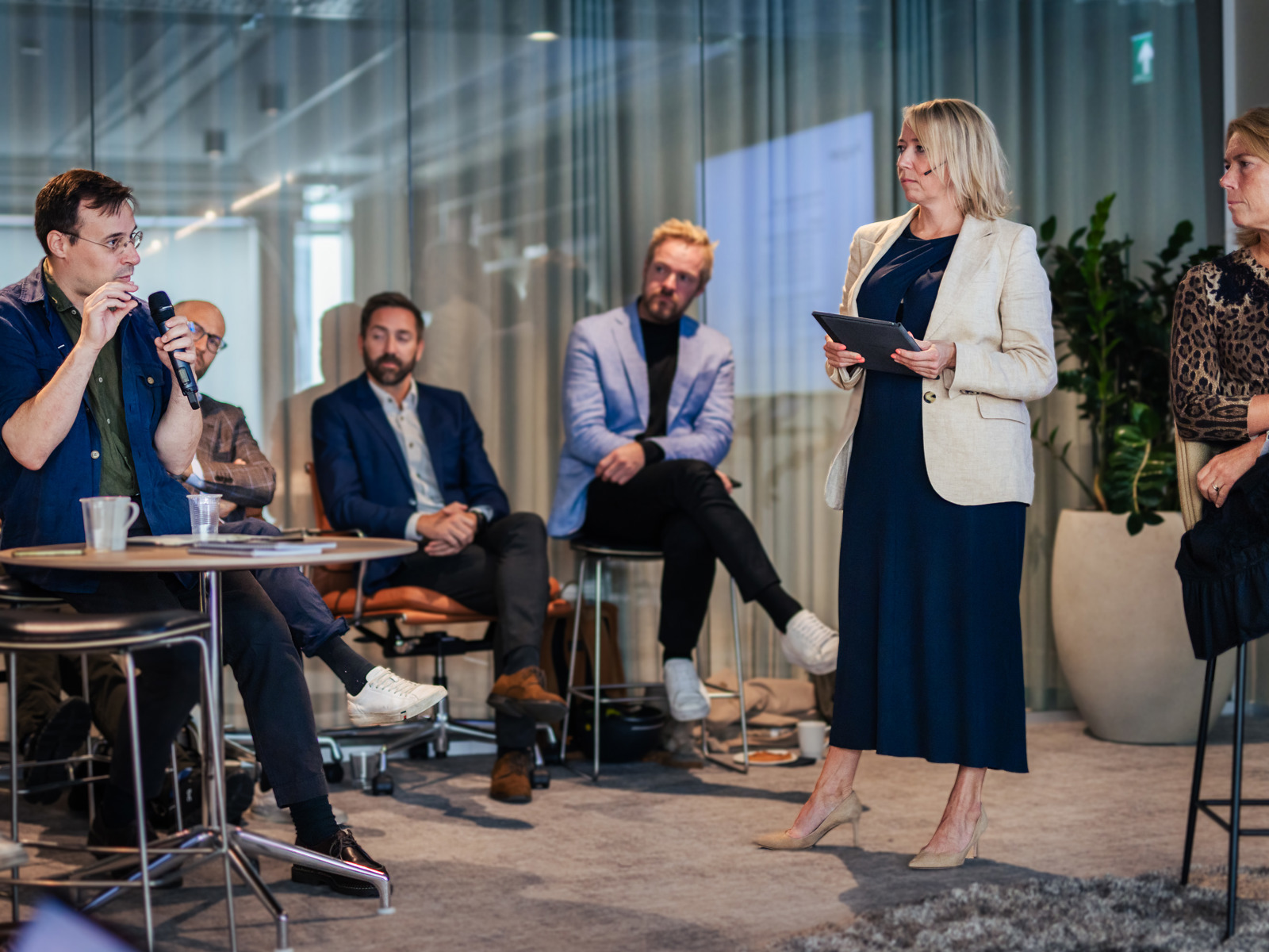 Frokostmøte i regi av OMA og Aspelin Ramm hvor Oslo nye kommuneplan (arealdel) ble diskutert. Hans Martin Aambø fra PBE og Maren Bjerkeng i dialog. Synnøve Lyssand Sandberg (Skanska) helt til høyre.