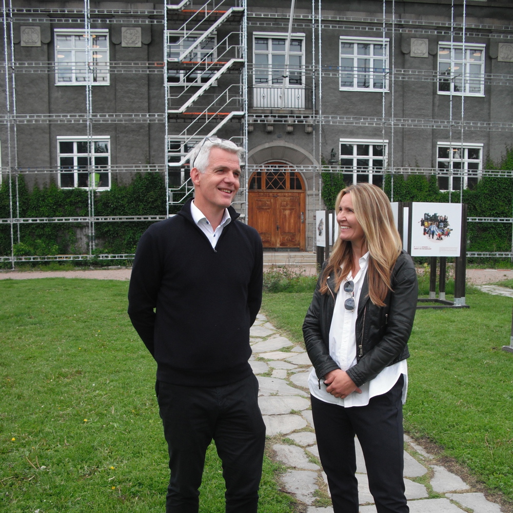 Utviklingsdirektør i Linstow Terje Lorentzen og divisjonsdirektør i Oslobygg Kjersti Folvik utenfor den gamle Veterinærhøgskolen. Linstow og Oslo kommune eier henholdsvis en og to tredjedeler hver av eiendommen som tidligere utgjorde Veterinærhøgskolen.