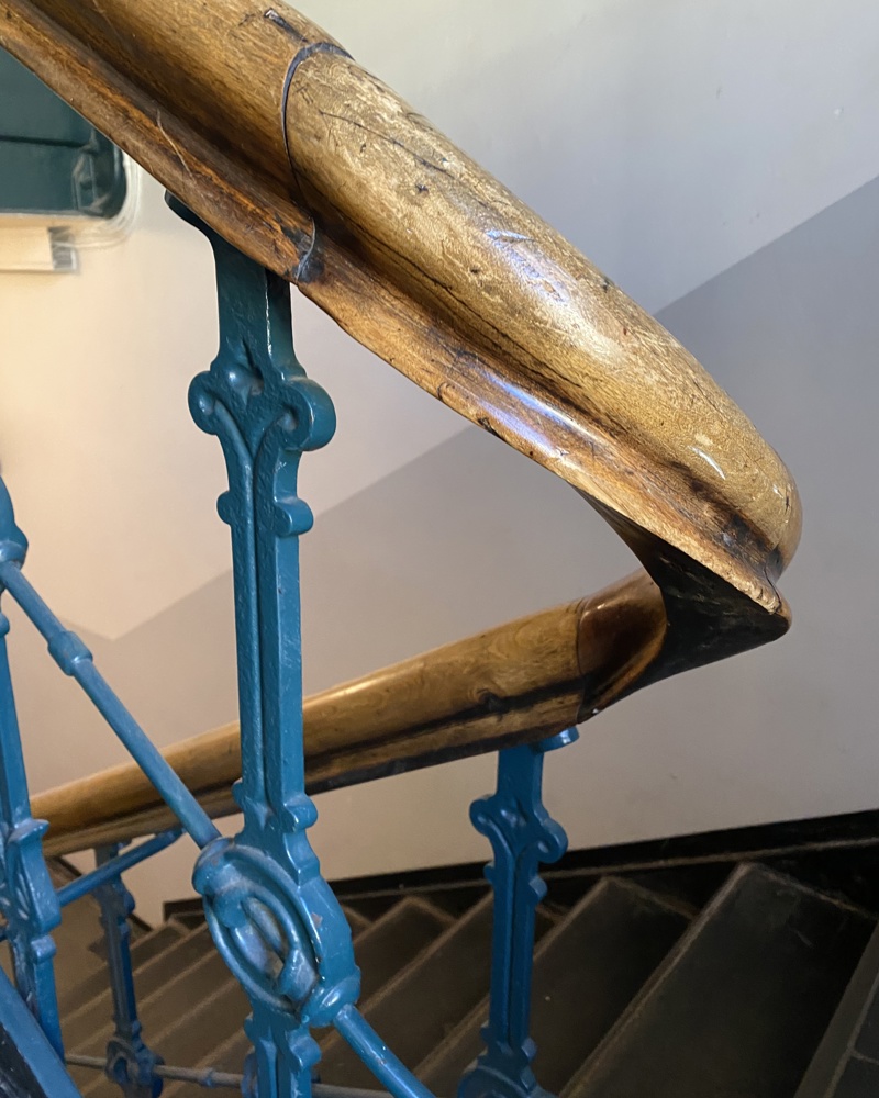 Håndløperen i trappeoppgangen som leder opp til leiligheten. Her har solide materialer tålt tidens tann, brukssporene setter oss i kontakt med historien.
