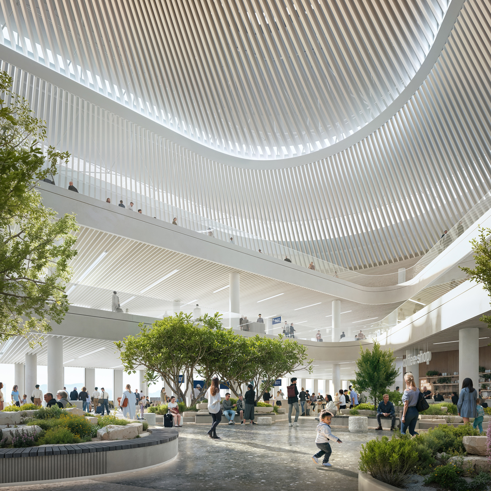 «En pragmatisk plan sikrer effektiv og intuitiv flyt, med en sammenhengende og naturlig materialpalett og innslipp av dagslys til alle deler av terminalbygningen», skriver kontoret videre.