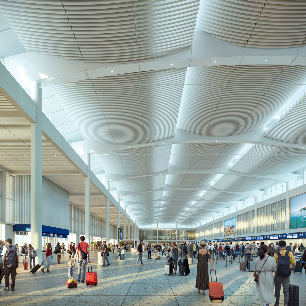 Illustrasjon: Grimshaw, Haptic and K-StudioNorsk-britiske Haptic har, sammen med Grimshaw fra London og K-Studio fra Athen, vunnet oppdraget med å tegne utvidelsen av den internasjonale flyplassen i Athen.