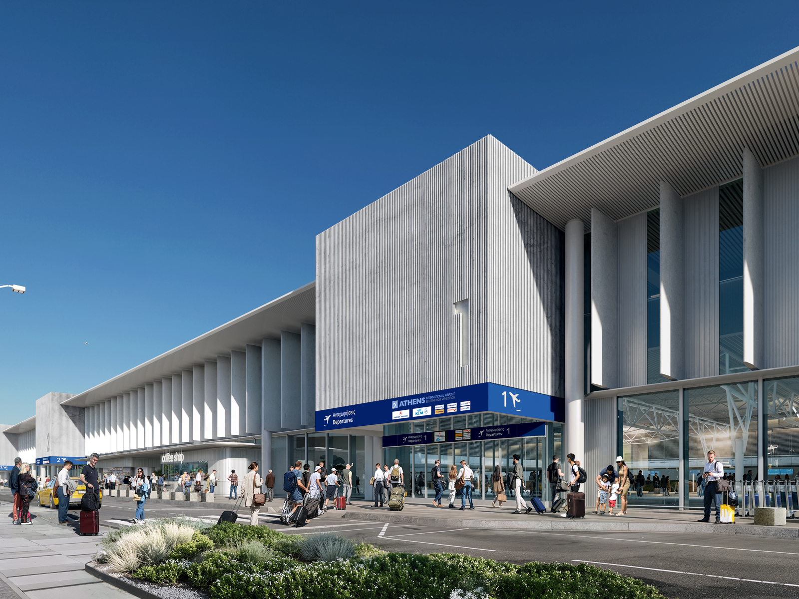 Vestfasaden av det nye tilbygget til flyplassen i Athen.