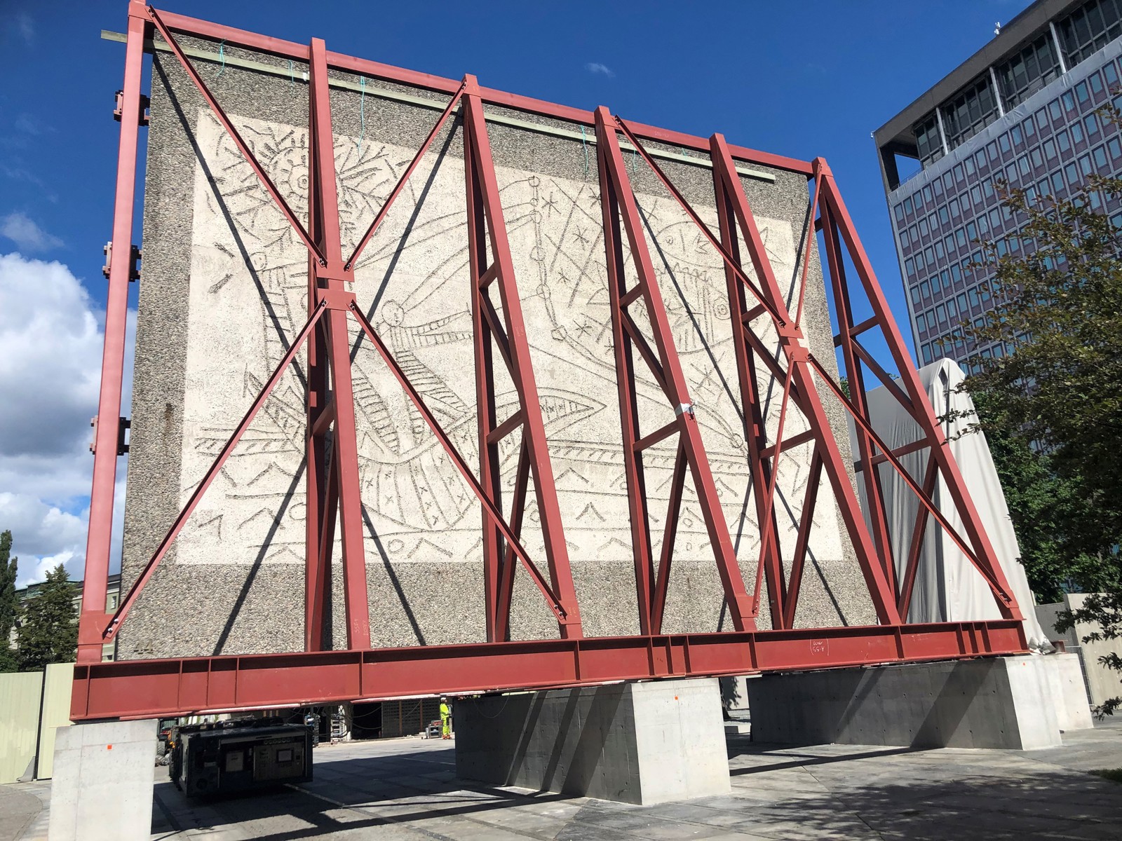 Stålriggen som ble bygget for å flytte Pablo Picasso-verket ‘Fiskerne’ fra den revne Y-blokka over til den nye A-blokka i regjeringskvartalet, som Matias Faldbakken foreslår å bruke i et nytt kunstverk.