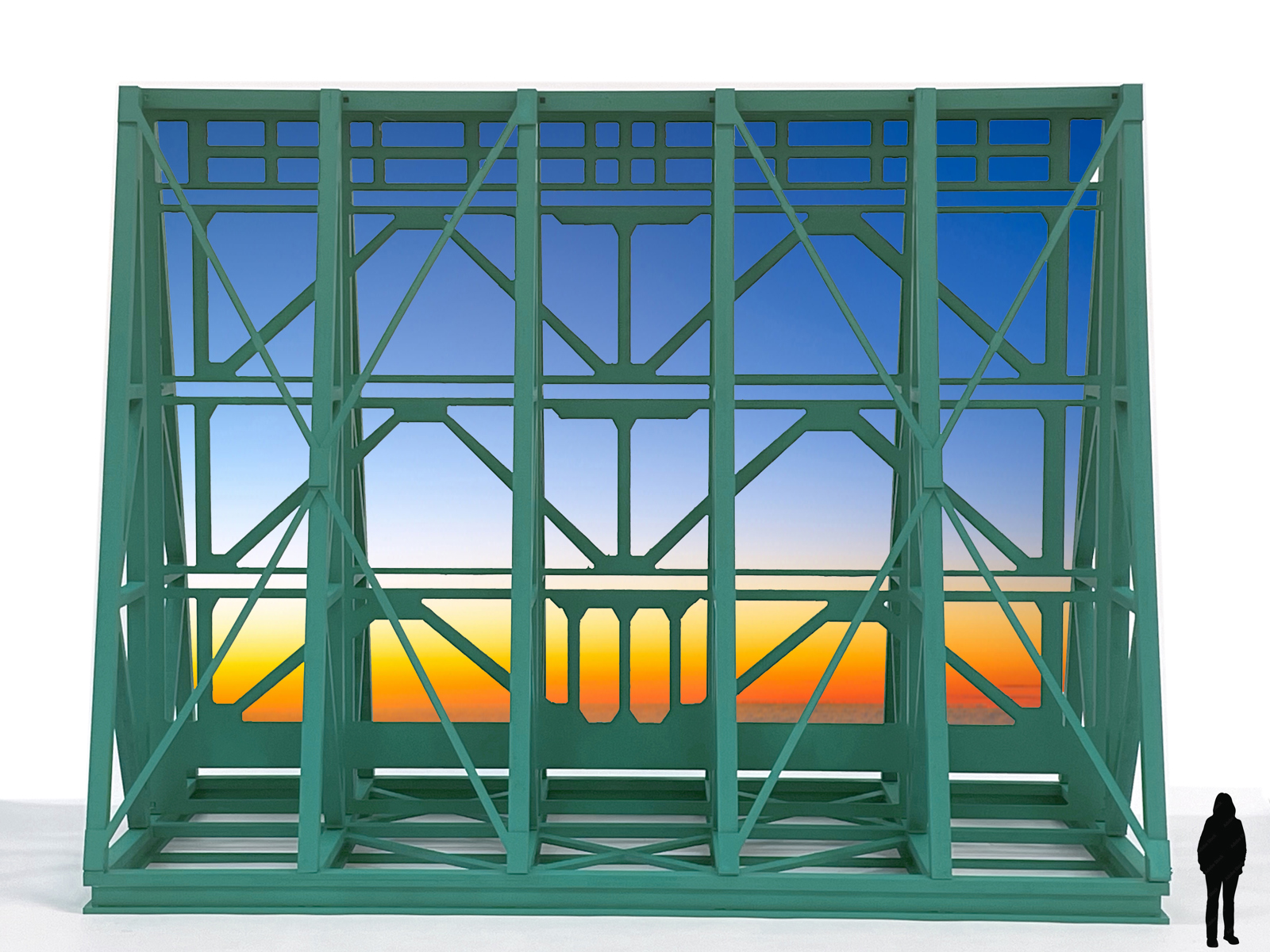 Matias Faldbakken har to skisseforslag, som begge baserer seg på å gjenoppføre stålriggen som ble bygget for å flytte Pablo Picasso-verket ‘Fiskerne’ fra den revne Y-blokka over til den nye A-blokka i regjeringskvartalet. I den ene versjonen fylles riggen med en monumental mosaikk. I den andre omgjøres riggen til et glassmaleri.