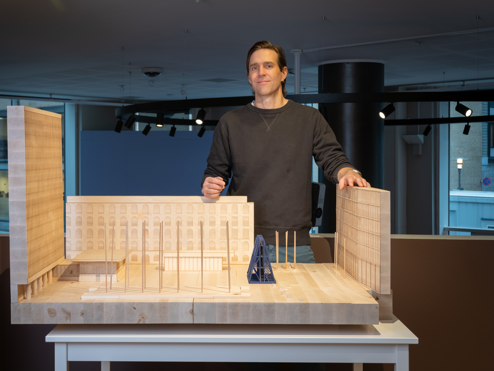 Matias Faldbakken med modellen til det nye 22. juli-minnestedet i Regjeringskvartalet.