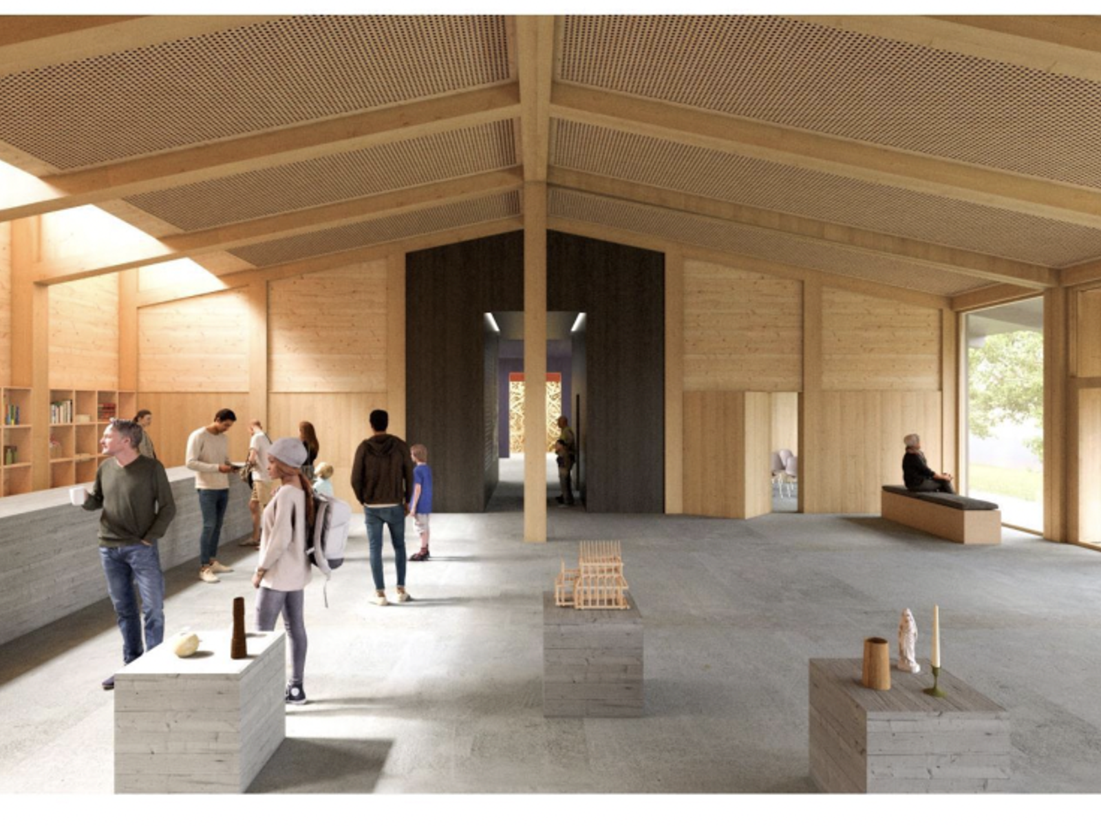 Illustrasjon fra et av de 124 forslagene som har kommet inn til konkurransen om nytt verdensarvsenter ved Urnes stavkirke. Foto: Fortidsminneforeningen