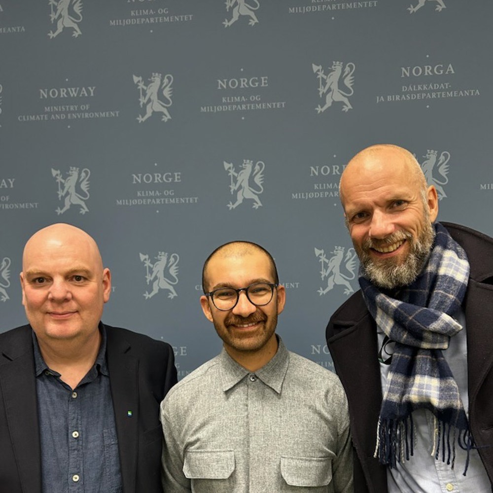 På lansering (f.v.): Torleiv Lohne fra Miljødirektoratet, seksjonsleder for kartlegging og geodata; Balén Yousef fra NLA og Bernt Audun Strømsli prosjektleder fra Kartverket.