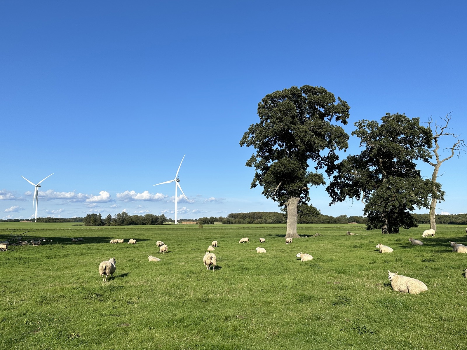 Hvordan kan fornybar energi produseres uten for mye naturinngrep? Her såkalt «eneriglandskap» fra Danmark, med sau, beiteland og godt voksne eiketrær.